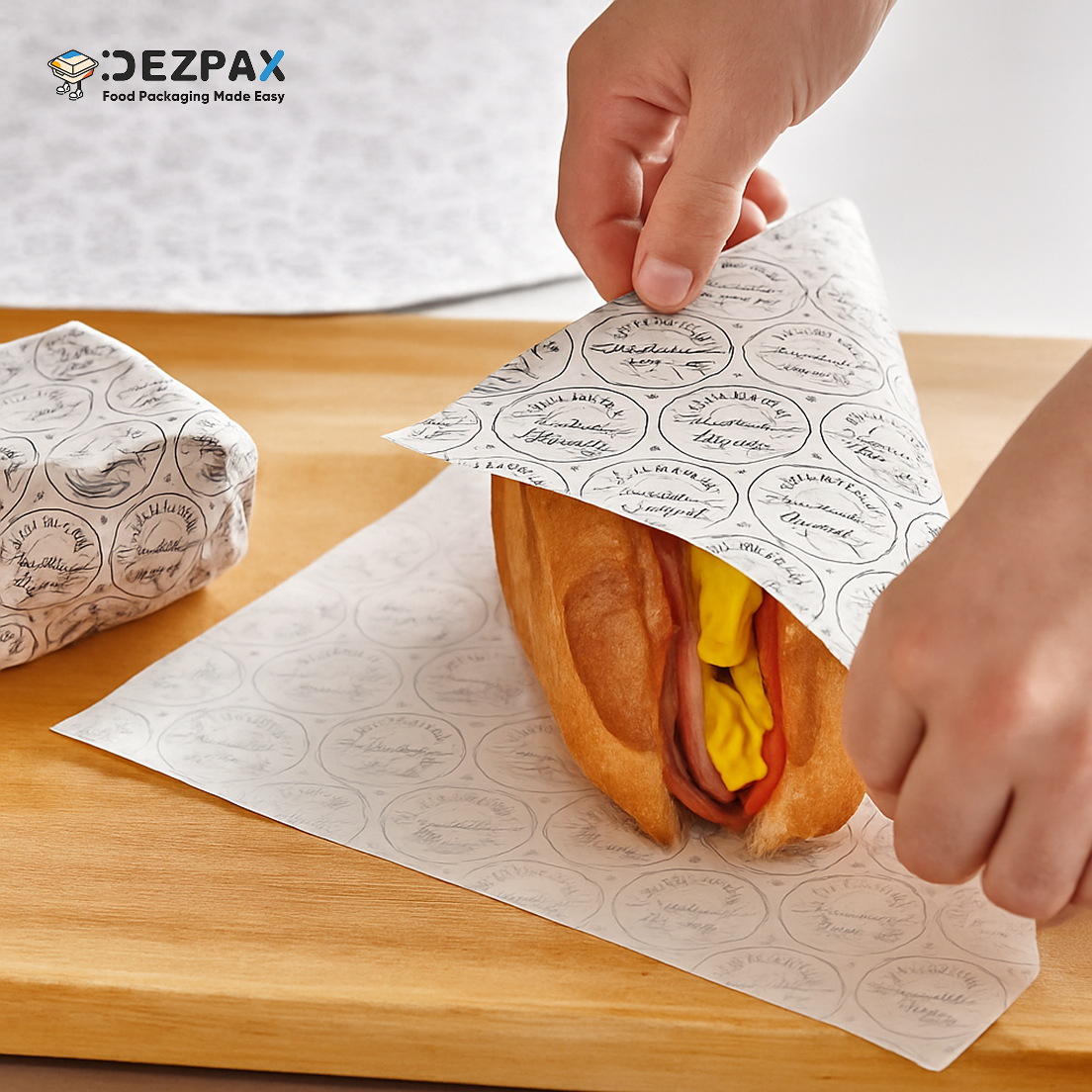 กระดาษ Food Grade ห่อ พัน ฉีกได้ ไม่ต้องพึ่งเทปกาว ไม่ต้องกังวลเรื่องสารปนเปื้อน ทานได้เลย เพื่อป้องการไม่อาหารเลอะมือ ประหยัดเวลาในการบริโภค ลดต้นทุนของบรรจุภัณฑ์ และยังมีให้เลือกหลากหลายขนาด โดยเริ่มต้นที่ขนาด 20X20 เซนติเมตร , 30X30 เซนติเมตร และ29X40 เซนติเมตร ที่สามารถรองรับอาหาร ประเภทเบอร์เกอร์ แซนวิชหรือขนมปัง เบเกอรี่ เช่น ครัวซองต์ แซนวิช ครีมฮอน ขนมปังบาร์แก็ต เป็นต้น